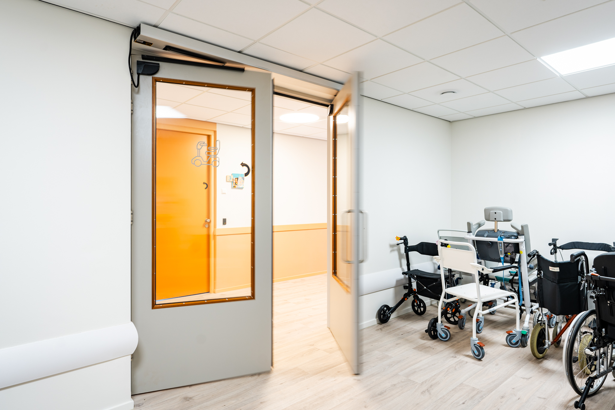 De binnendeuraandrijving is standaard voorzien van antiverbrijzelingsbeveiliging en voldoet aan de EN 16005-norm. Bij stroomuitval blijft de deur handmatig bedienbaar, wat bijdraagt aan de veiligheid en betrouwbaarheid in dagelijks gebruik.